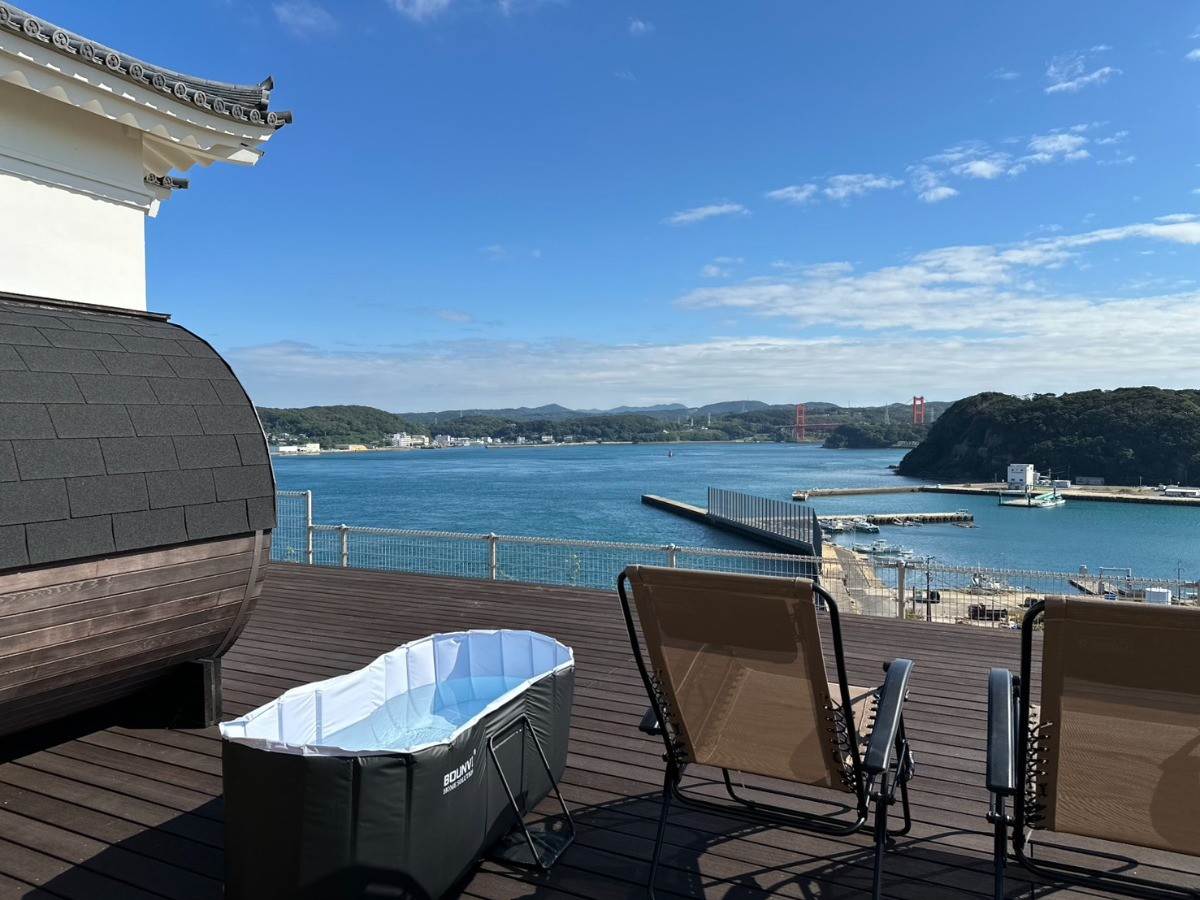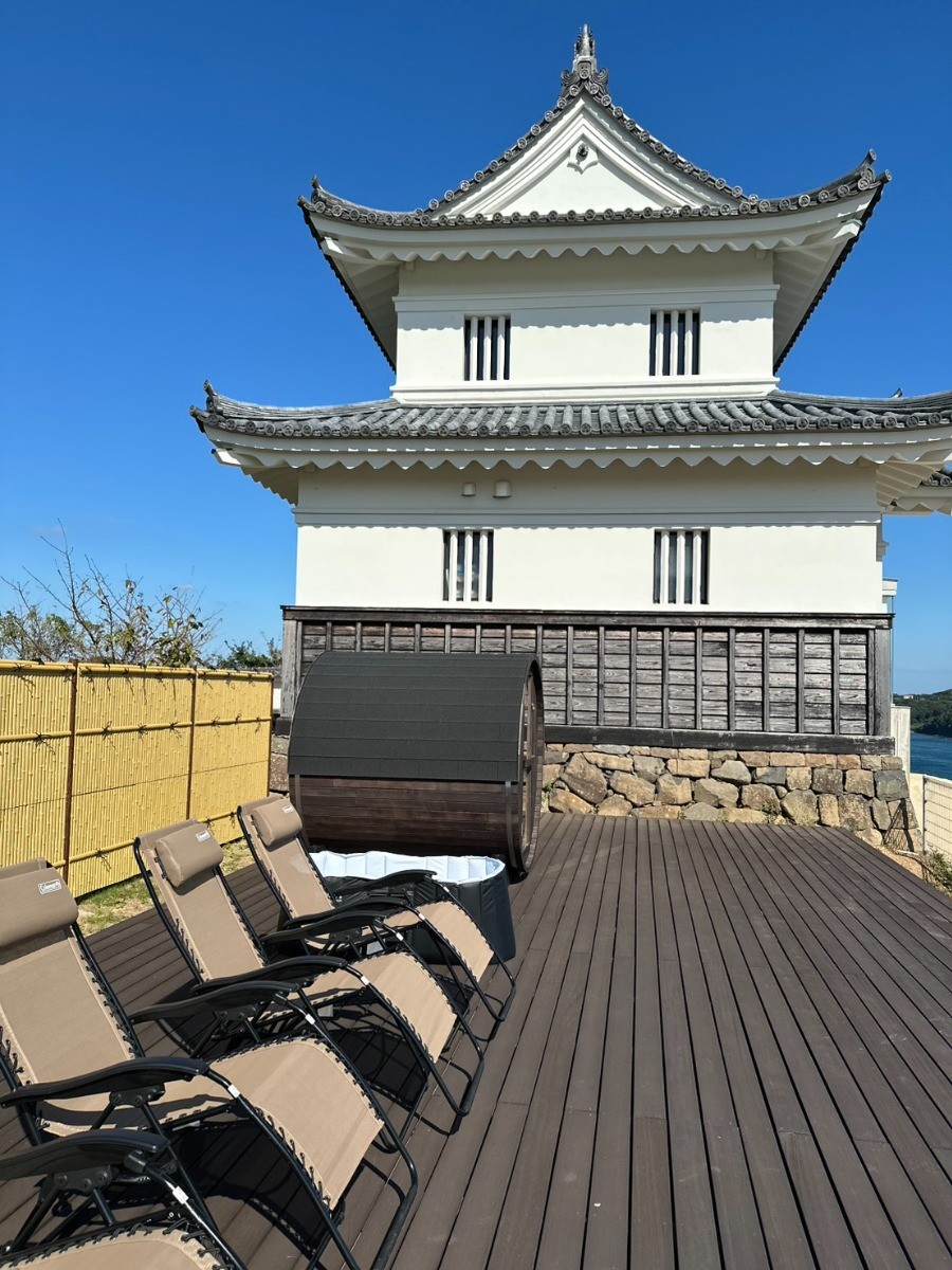 平戸城内の宿泊施設「懐柔櫓」横ウッドデッキに誕生した完全プライベートサウナ。レッドシダーの4人用バレルサウナに、フィンランドのサウナヒーターメーカーHARVIA(ハルビア)の電気ヒーターとサウナストーンを設置。本格的なフィンランドサウナをお楽しみいただけます。