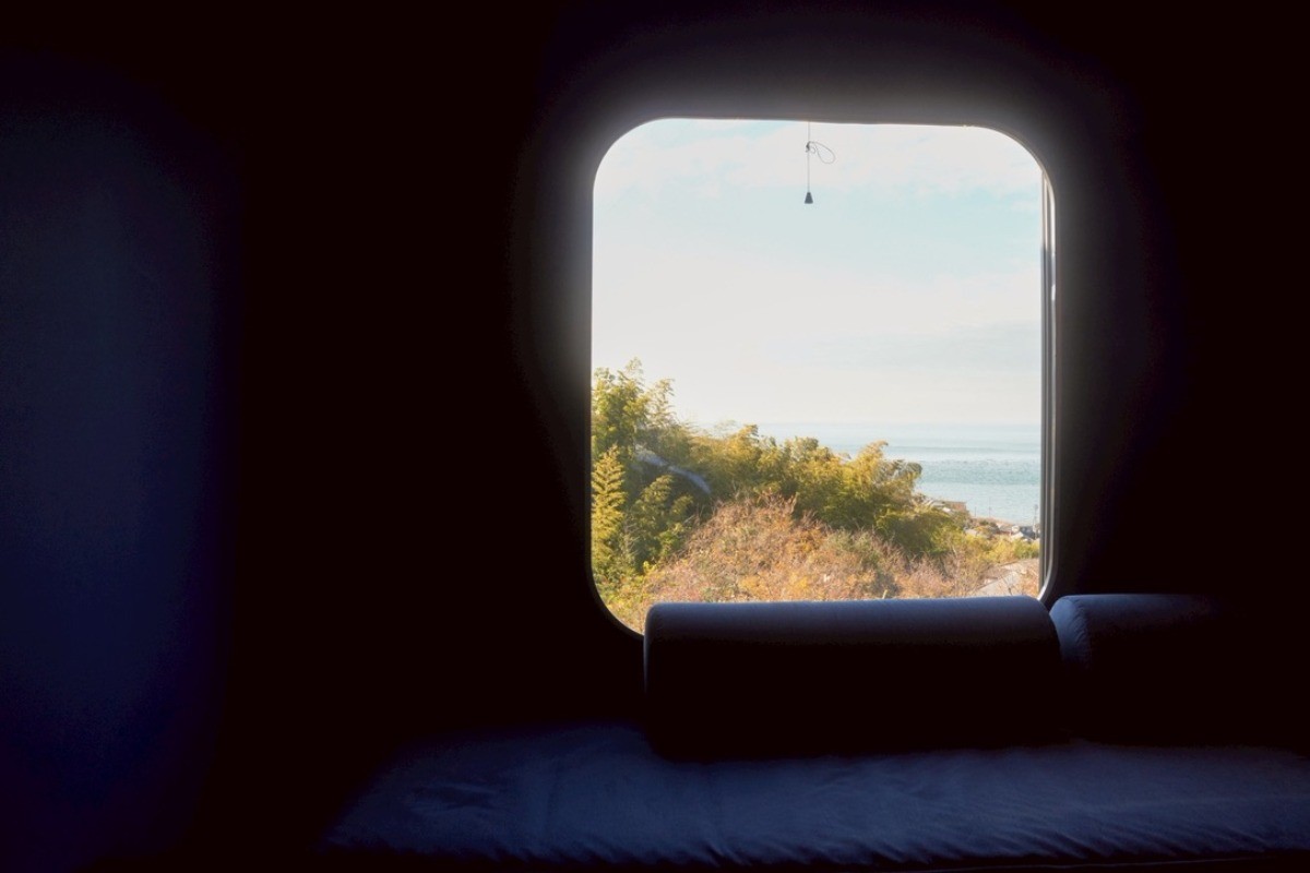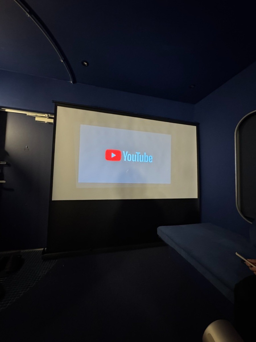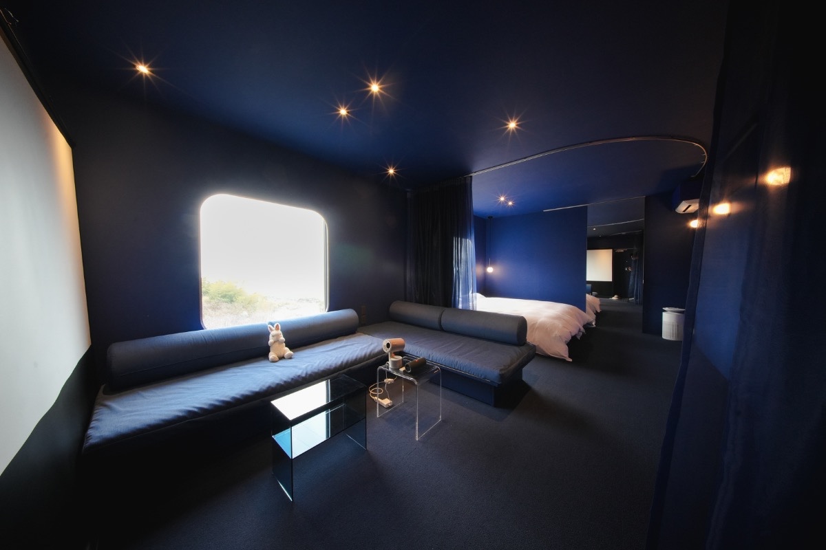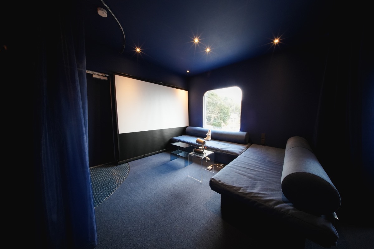 夕陽のオレンジ色から月明かりの神秘的なブルーへと移ろう空間で、映画を観たり語り合ったり。