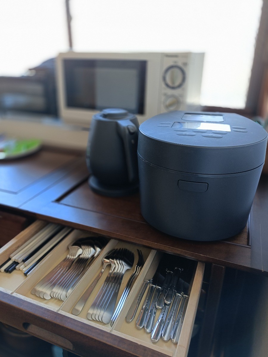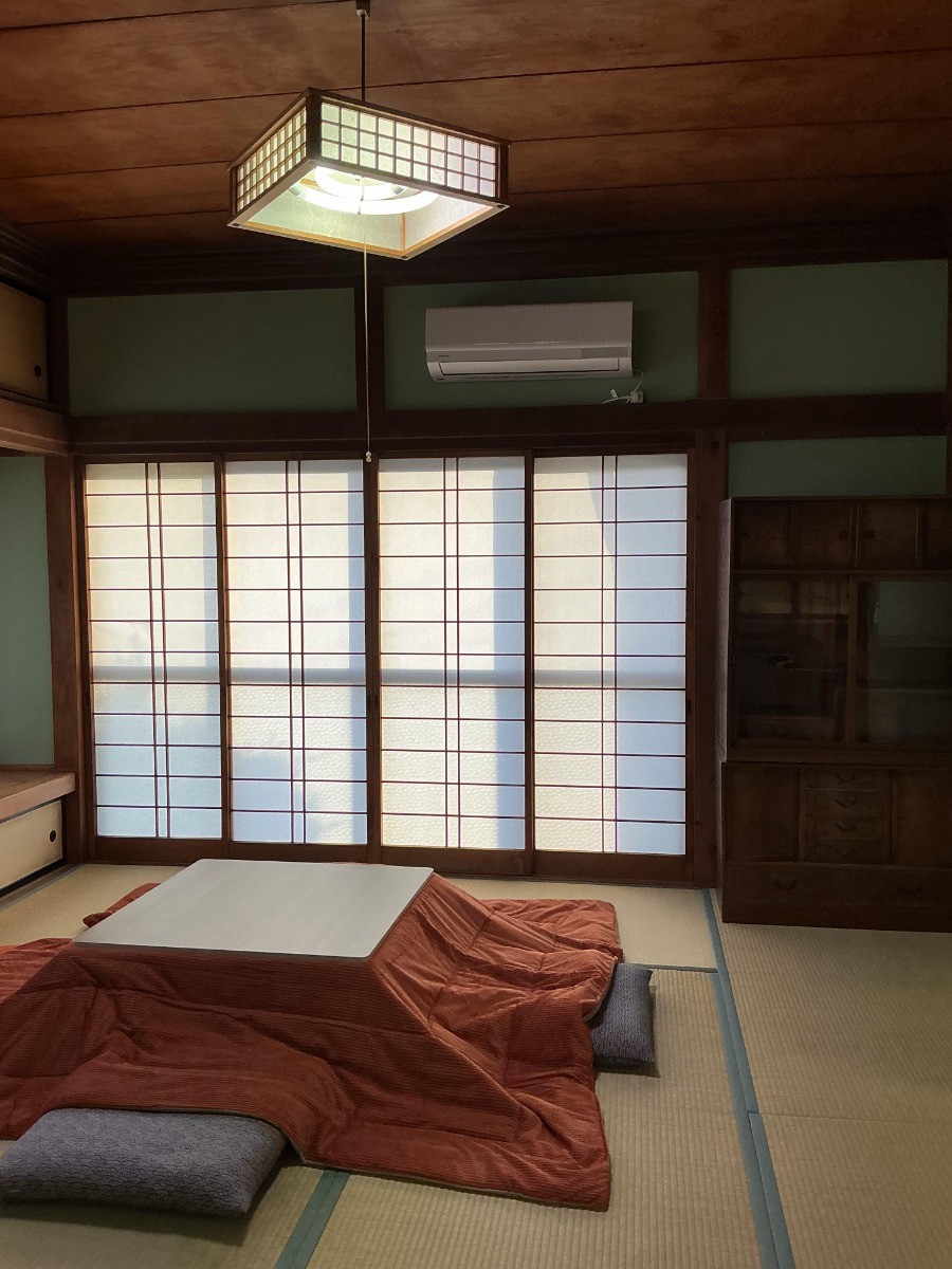 一日一組限定のGuest house 湊、楽しみ方はいろいろ。非日常をゆっくりと味わっていただきたいので、テレビはありません。掘りごたつのリビングで、テーブルゲームをしたり、おしゃべりをしたり。キッチンにはひと通り自炊ができるよう、備品や食器も整っております。
