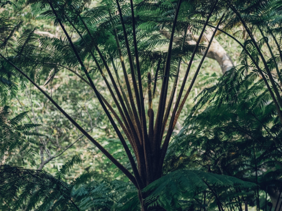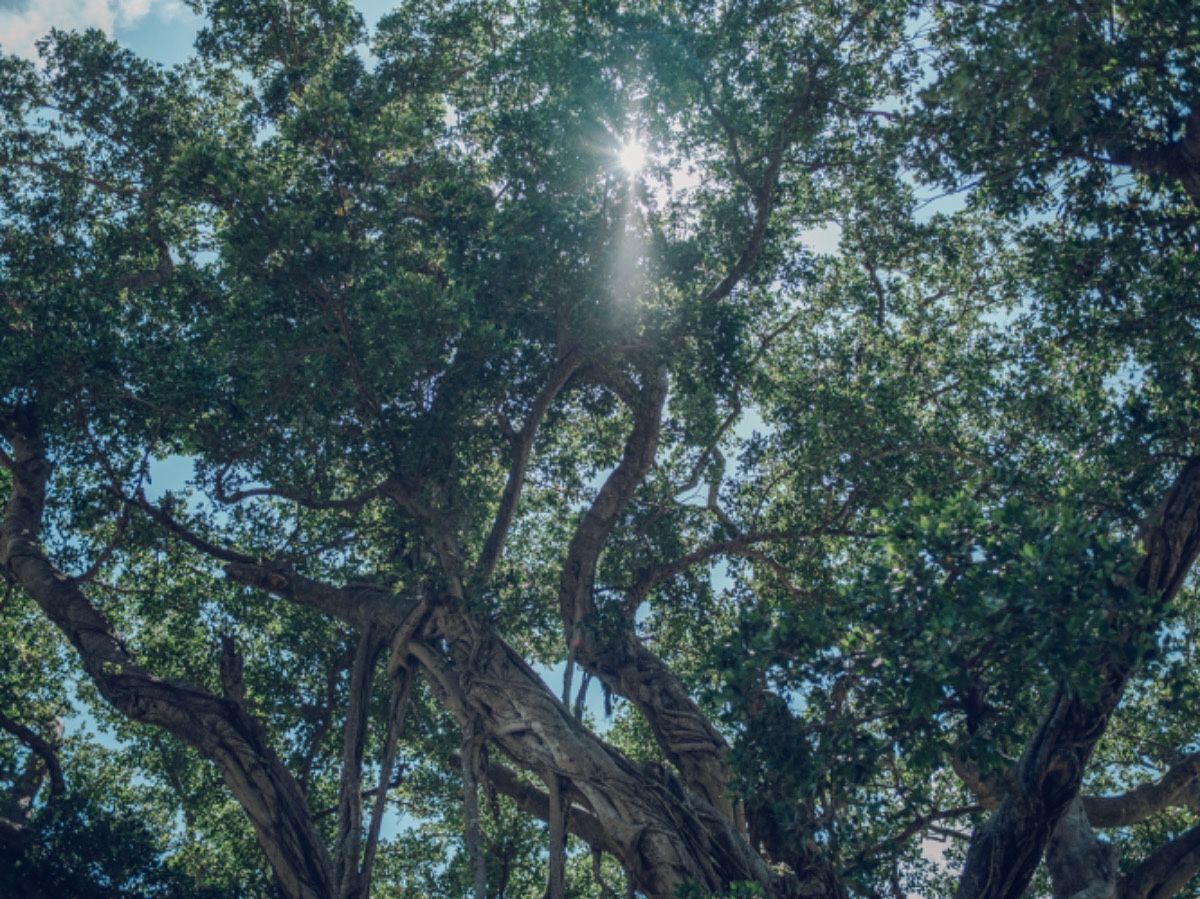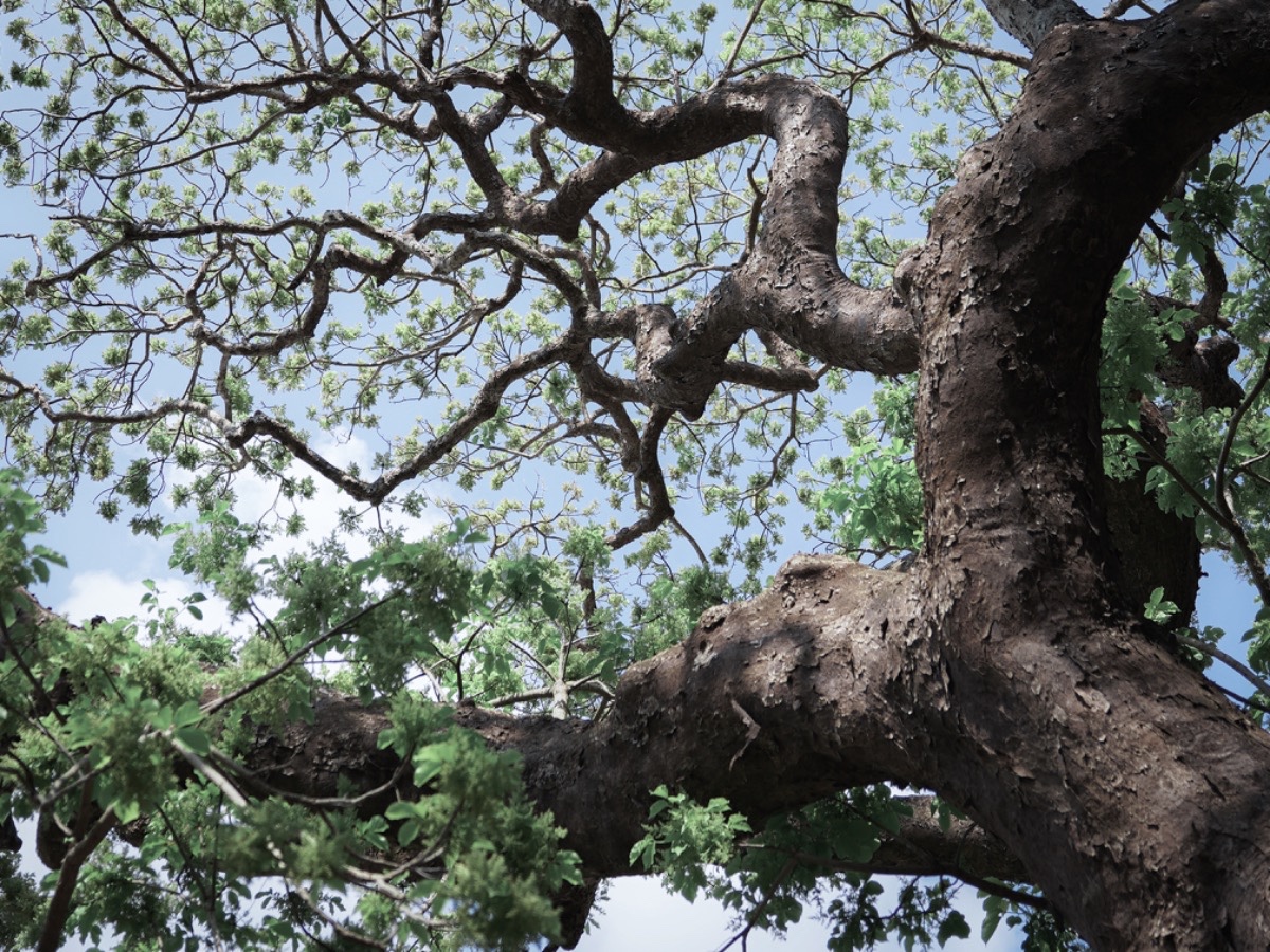 樹齢百年を超えるアカギの大木。ヒカゲヘゴやビロウ、月桃、芭蕉など、この土地に息づく植物に囲まれた庭。葉はそれぞれに異なるかたちを持ち、その違いが静かな美しさをつくります。