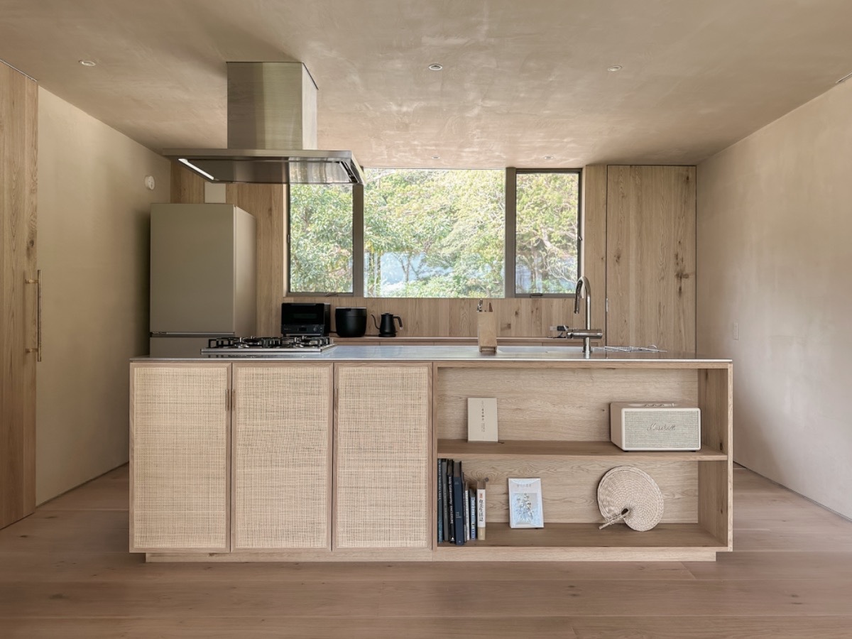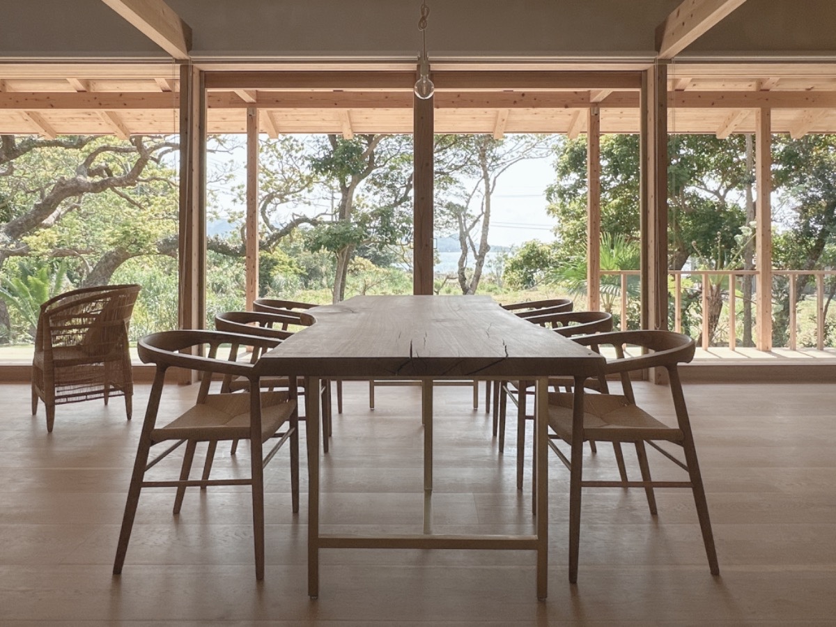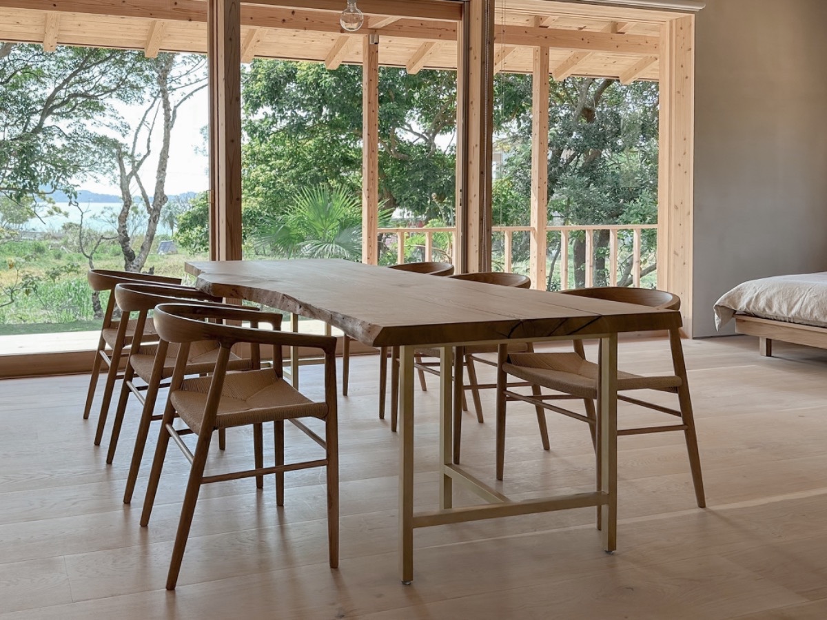 大きな楢の一枚板のダイニングテーブルと、森の蒼、海の碧を望むアイランドキッチン。気兼ねなく食卓を囲むひとときをお愉しみいただけます。