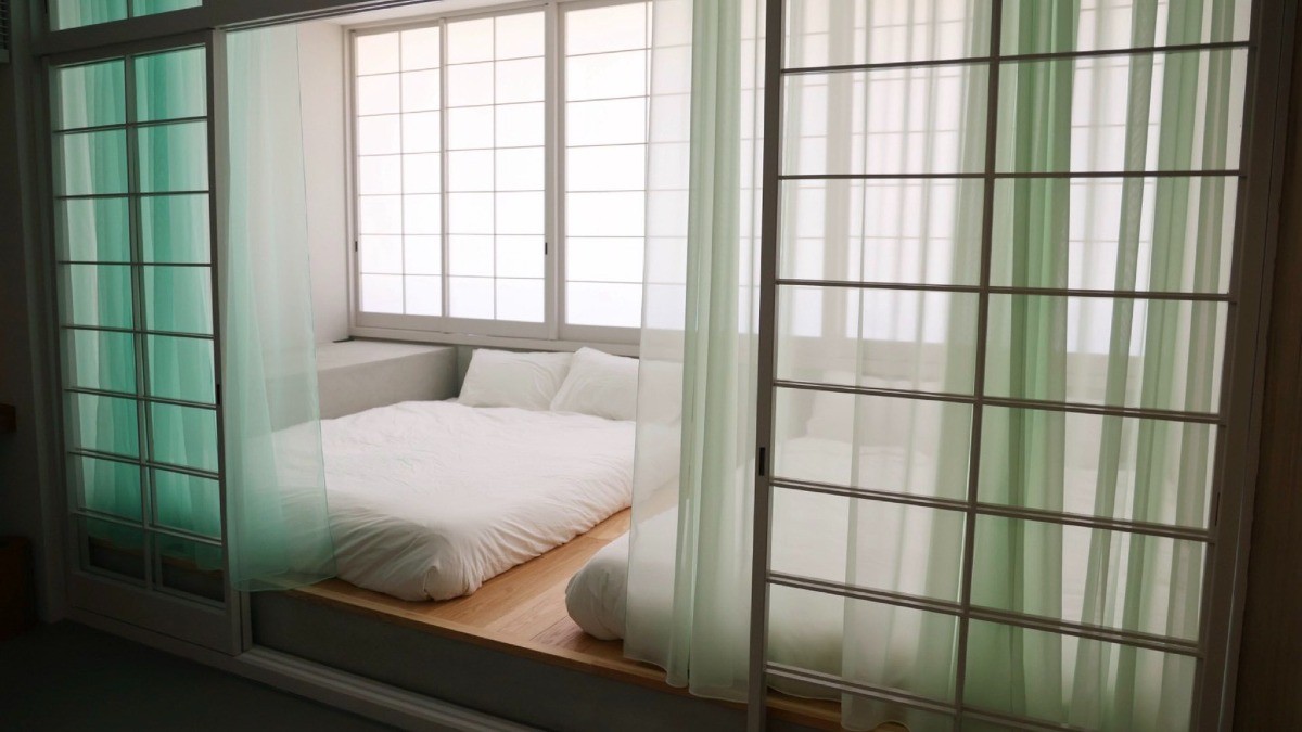 【hokuhoku - ダブルツインルーム -】ダブルベッド2台の2人〜4人部屋。青と緑の2枚のカーテンが特徴のあるお部屋です。元々も畳の部屋だった構造、障子などをそのまま活かし、和とも洋とも言えない空間ができました。友人と2人、家族でご利用いただくのにおすすめです。