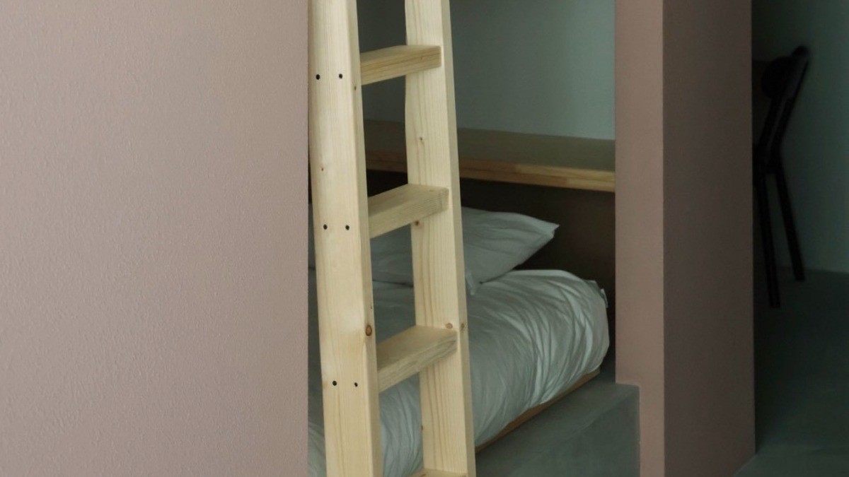 【kotokoto - クアッドルーム -】シングルベッド4台の4人部屋。ピンクの壁と角のアールが特徴の二段ベッドが並ぶお部屋です。広々として壁付けのソファ、3人掛けのデスクなど、1フロアを贅沢に使ってつくりました。友人同士での旅行、会社やチームでの合宿におすすめです。