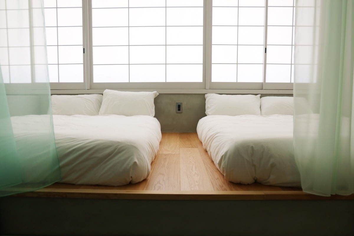 マットレスやシーツは山梨県にある寝具ブランド「sinso」のものを使用しています。元々畳の部屋だった構造をそのまま活かし、和とも洋とも言えない間のような空間をつくりました。青と緑が特徴のメインとなるカーテンは「fab-」。