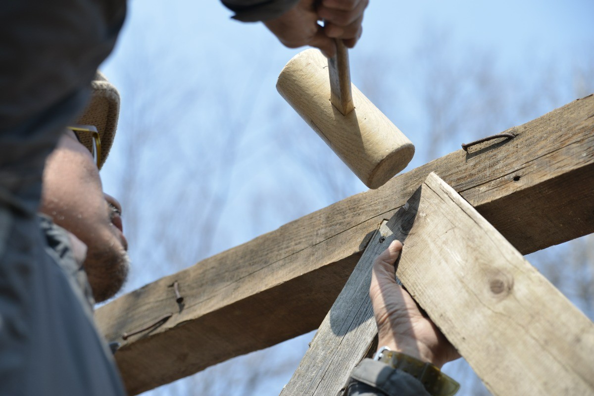 古い材を磨き直し、1本1本手刻み加工で組み上げていきます