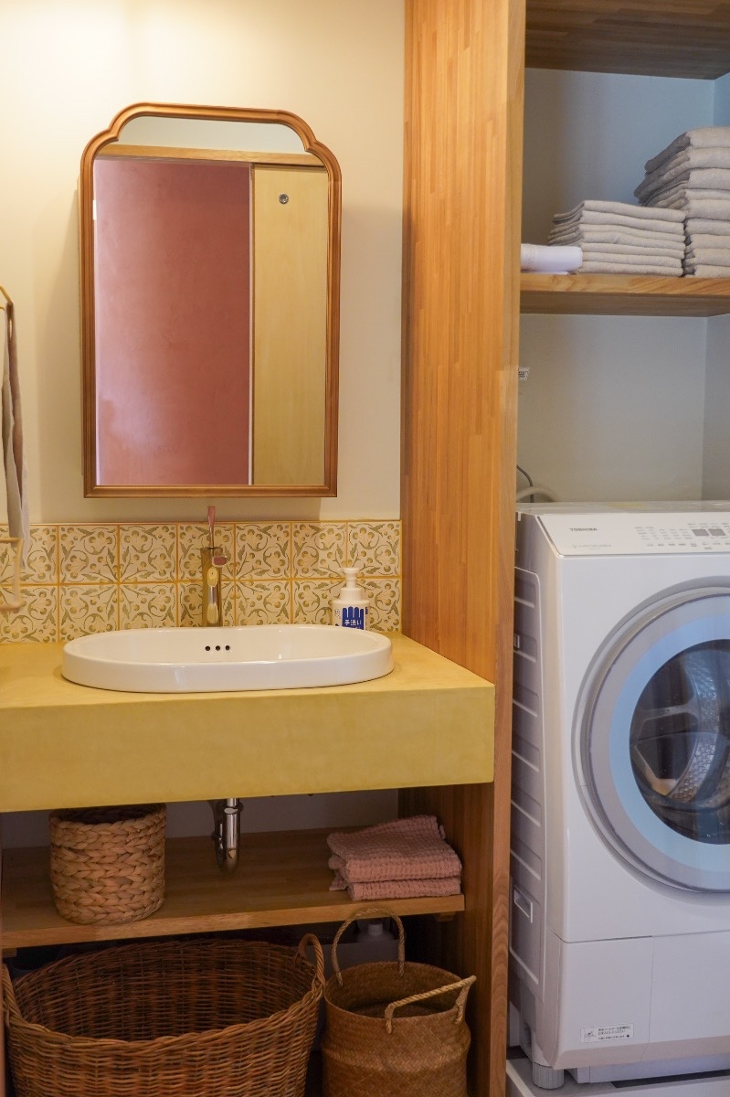 ▲洗面所には洗濯乾燥機、洗剤の用意がございますのでいつでもご利用ください。滞在中、リネンの交換はしておりません。お風呂場は無添加のシャンプー、リンス、ボディーソープがあり、バスタブも付いています。