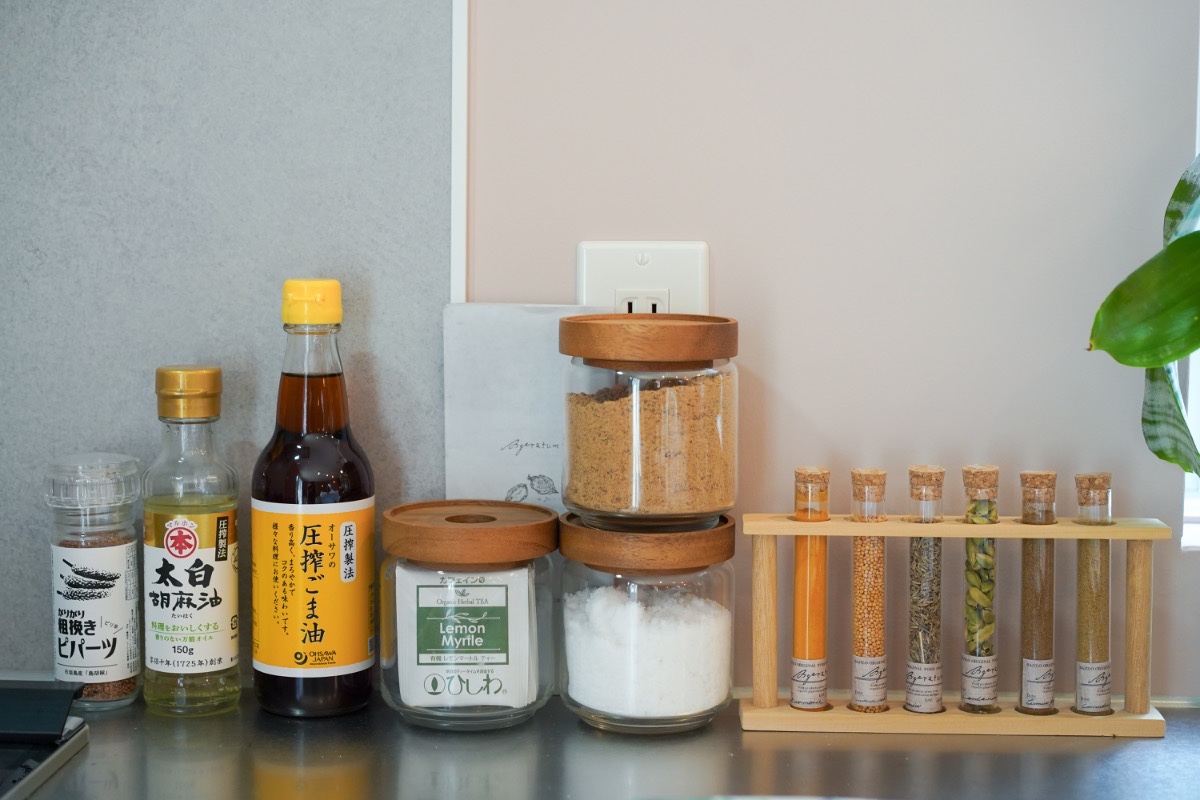 ▲キッチンには3口コンロ、ブレンダー(バイタミックス)、フードプロセッサー、調理器具、冷蔵庫、冷凍庫、炊飯器、トースターなどフル装備です。また、塩、胡椒、黒糖、醤油、オイル、スパイス、コーヒー豆、紅茶、ハーブティを常備しています。