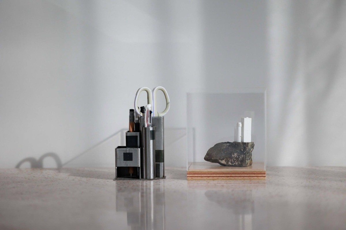 (左)鉄工作家・古渡大さんによるペン立て /(右)キムラカヅキさんによる「手の中にある世界」
